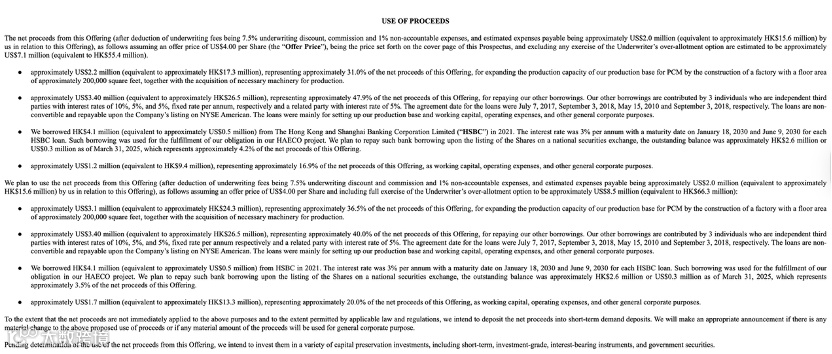 其二,约 340万美元(约2650万港元)约占净募资47.9%,用于偿还其他借款(来自3名独立第三方及1名关联方,均为不可转换贷款,约定在公司于NYSE American上市时到期偿还;借款主要用于建设生产基地、营运资金及日常开支);