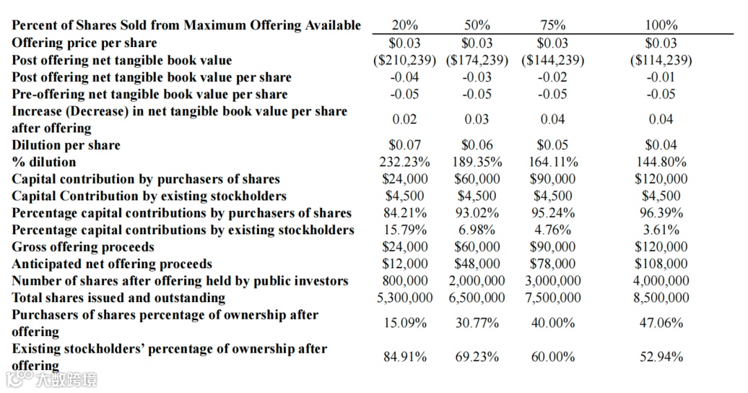 从发行规模与定价来看,公司计划发行 400 万股普通股,每股面值 0.001 美元,发行价格固定为 0.03 美元 / 股,无最低发行数量要求 —— 这意味着无论最终销售多少股份,本次发行均不会因 “未达募资门槛” 终止,募集资金总额最高可达 12 万美元(按 400 万股全额销售计算)。