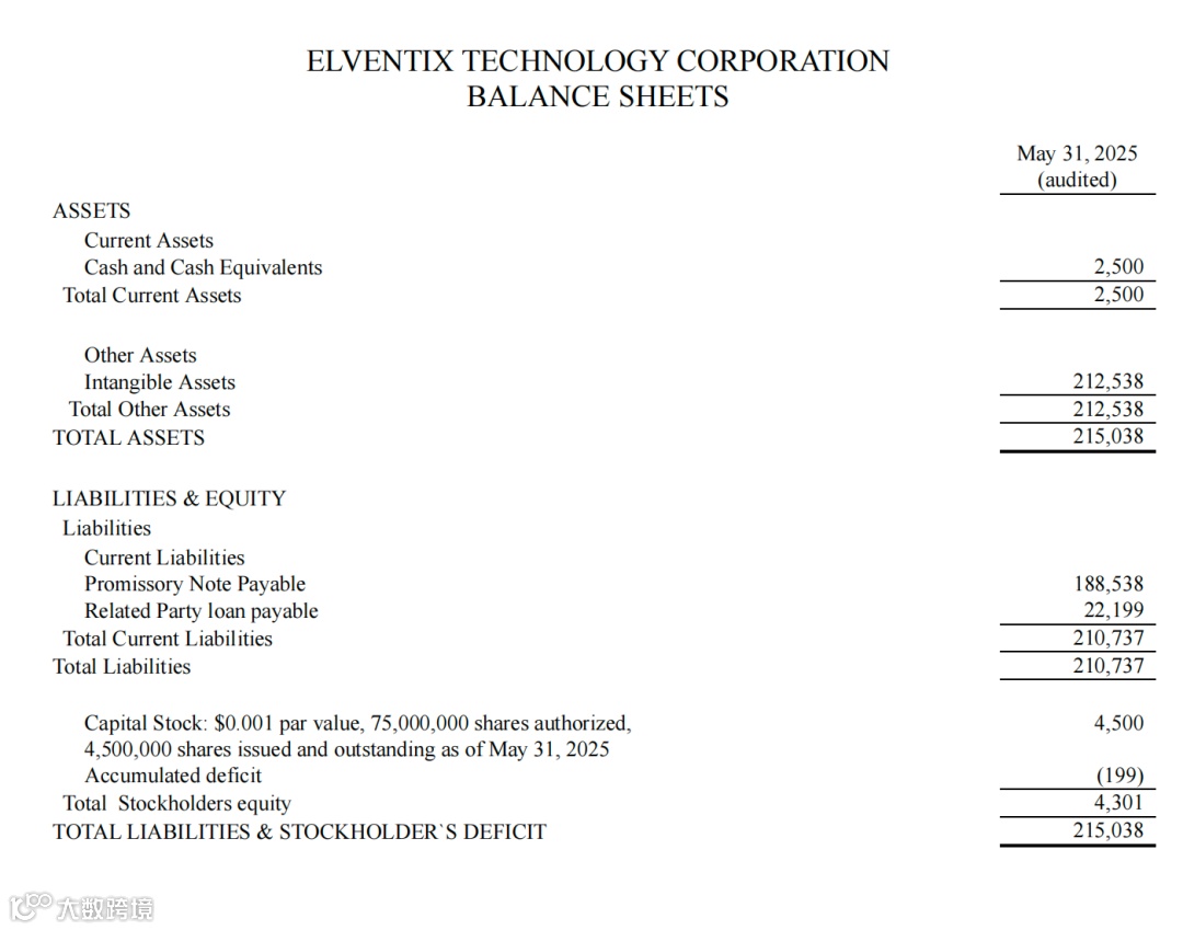 从资产与负债情况来看,截至 2025 年 5 月 31 日(经审计),公司总资产为 21.50 万美元,其中核心资产为无形资产 21.25 万美元(即收购 Smarterest APP 形成的资产),现金及现金等价物 2500 美元;总负债 21.07 万美元,主要包括应付 Smarterest Incorporated 的收购票据 18.85 万美元(无利息,原到期日 2025 年 11 月 14 日,后延期至 2025 年 12 月 31 日)、CEO 个人垫款 2.22 万美元(无息);股东权益 4301 美元,主要来自 CEO 认购普通股的 4500 美元出资(2025 年 5 月 15 日,CEO 以 0.001 美元 / 股的价格认购 450 万股普通股,募资 4500 美元),扣除累计亏损 199 美元后形成。