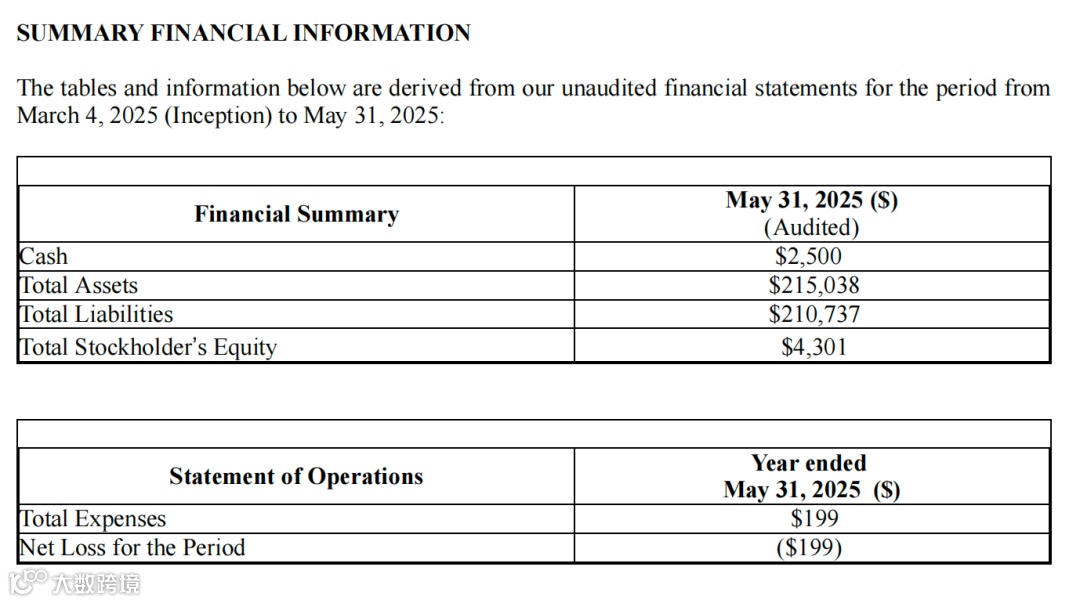 截至 2025 年 8 月 31 日(未经审计),公司财务数据随业务推进出现变化:总资产增至 21.76 万美元,主要因预付费用(9900 美元)与无形资产微调(20.73 万美元,系无形资产摊销所致);现金及现金等价物降至 403 美元,主要因运营费用支出;总负债增至 23.25 万美元,核心因 CEO 个人垫款增加至 4.40 万美元(用于支付审计、法律等专业服务费用);股东权益转为 - 1.49 万美元,累计亏损扩大至 1.94 万美元,亏损增加主要源于运营费用增长 ——2025 年 6 月 1 日至 8 月 31 日,公司发生银行服务费 76 美元、无形资产摊销 1.06 万美元、专业服务费(审计、法律)8526 美元,合计运营费用 1.92 万美元,均为业务初期的必要投入。