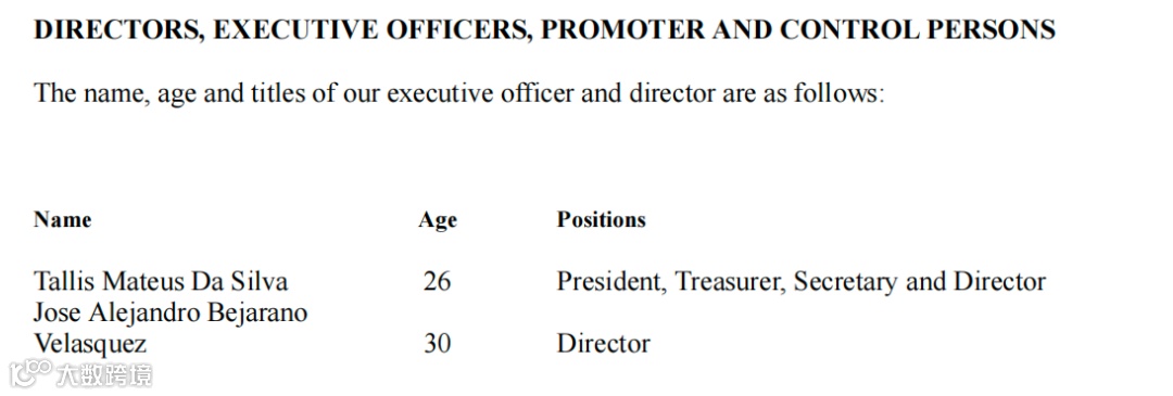 从注册与合规层面来看,公司注册地为美国怀俄明州,主行政地址为怀俄明州谢里登市 1309 Coffeen Avenue STE 1200(邮件转发地址),无实体办公场所,日常运营通过远程协作完成,同时聘请 BizFilings 作为注册代理,负责处理公司注册维护、法律文件接收等事务,降低行政运营成本。公司的治理机构为董事会,目前由 2 名董事组成(CEO Tallis Mateus Da Silva 与 Jose Alejandro Bejarano Velasquez),暂无下设专业委员会(如审计委员会、薪酬委员会),决策采用 “全员协商 + CEO 主导” 的模式,确保战略落地效率;根据怀俄明州公司法及公司章程,董事任期至下一次股东大会选举完成,高管由董事会任命并对董事会负责,治理机制简洁且权责清晰。