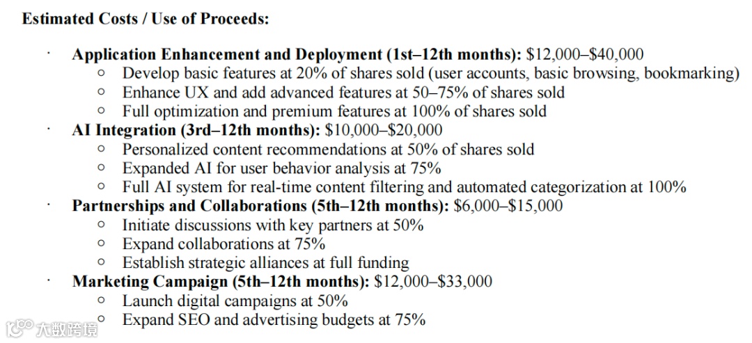 若本次 400 万股普通股全额销售(募资总额 12 万美元,扣除 1.2 万美元发行费用后,净额 10.8 万美元),资金将按以下比例分配:其中 4 万美元用于 “应用增强与部署”,占比最高,主要覆盖 Smarterest APP 的技术升级成本 —— 包括开发实时 AI 内容过滤模块(实现用户行为分析与动态推荐优化)、多平台同步功能(支持 iOS 与 Android 端数据互通)、个性化推荐算法迭代,同时涵盖 APP 在应用商店(苹果 App Store、谷歌 Play Store)的上架维护费用,计划在发行后 1-12 个月内完成核心功能落地;2 万美元投入 “AI 整合”,用于引入机器学习模型,提升内容分类精度(如按新闻主题、地域、用户阅读习惯自动标签化)与自动化摘要生成能力,预计在发行后 3-12 个月内完成模型训练与上线,进一步优化用户阅读效率;1.5 万美元用于 “合作与生态搭建”,主要用于与新闻媒体、技术服务商建立合作关系 —— 包括接入主流媒体 API 以扩充内容来源、与第三方技术公司洽谈数据合作,计划在发行后 5-12 个月内启动合作谈判并落地首批合作项目;剩余 3.3 万美元则投入 “营销推广”,通过数字广告(社交媒体投放、搜索引擎优化)、 influencer 合作、目标用户定向推广等方式提升 Smarterest APP 的品牌知名度与下载量,目标在发行后 12 个月内实现初始用户积累,为后续营收转化奠定基础。