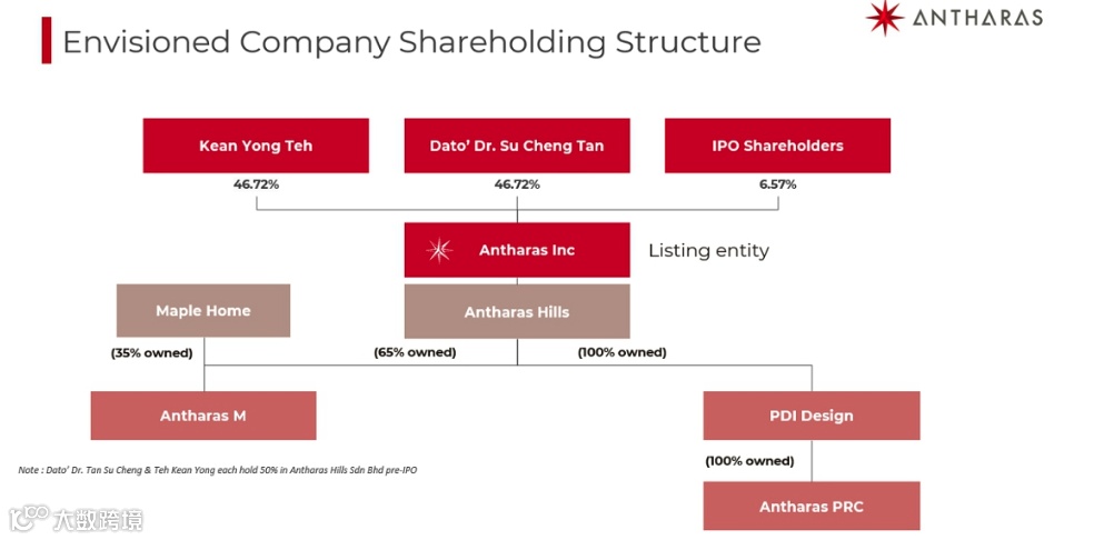 在 IPO 完成之前,Antharas Inc 由两位联合创始人 Kean Yong Teh 和 Dato’ Dr. Su Cheng Tan 各自持股 50%,共同掌控公司全部股权。上市后,两位创始人的持股比例将均稀释至 46.72%,其余 6.57% 股份将由公众投资者持有。公司注册地为开曼群岛,作为境外上市实体,其主要业务通过全资子公司 Antharas Hills 进行整合管理。