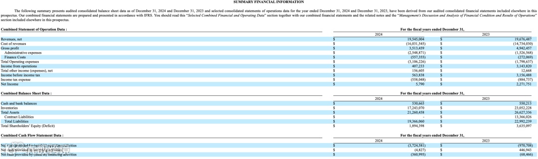根据招股书披露,截至 2024 年 12 月 31 日,Antharas 实现收入约 1,954.5 万美元,与上年基本持平,但毛利明显下降至 351.3 万美元,同比下滑超过 28%。主要原因在于单位成本上升以及行政费用增加。同时,融资成本也显著增长,2024 年财务费用为 55.7 万美元,高于 2023 年的 27.2 万美元。