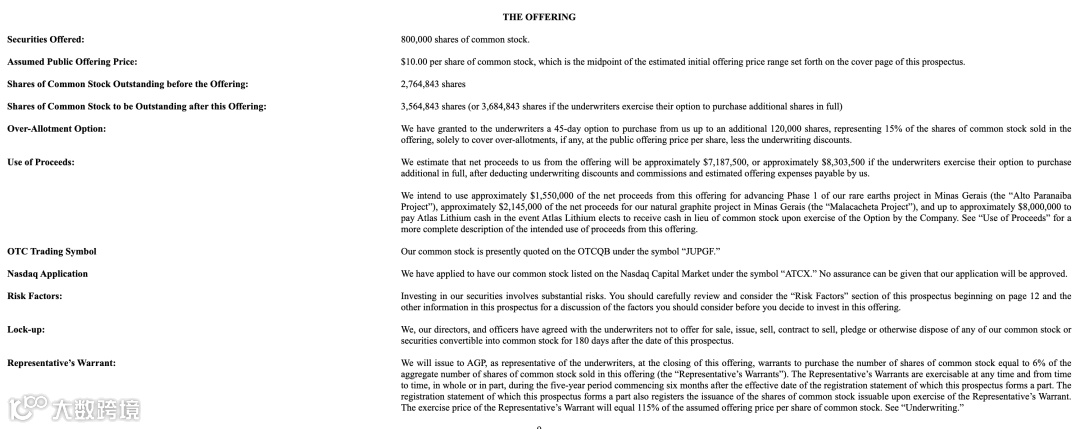 Atlas 此次发行 80 万股普通股,预计募资净额 718.8 万美元,承销商享有 120,000 股的超额配售权。募集资金将分配为:约 155 万美元用于推进巴西 Alto Paranaiba 稀土项目第一阶段钻探与技术研究;约 214 万美元用于巴西 Malacacheta 石墨项目的钻探与研究;高达 800 万美元预留用于收购 Atlas Lithium 在期权协议下的股份或支付现金;其余资金作为 Phase 2 与 Phase 3 勘探及营运资金使用。