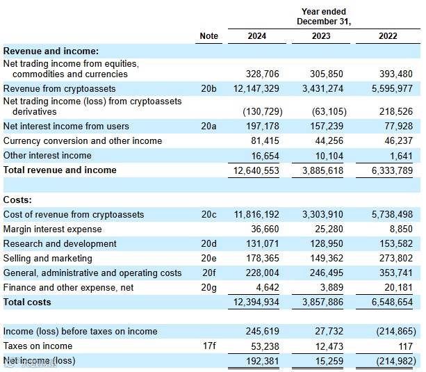 财务表现方面,eToro近年来经历了快速增长。根据招股书,2022年至2024年,公司的营业收入分别为63.34亿美元、38.86亿美元和126.41亿美元。虽然2022年公司录得净亏损2.15亿美元,但2023年实现净利润1525.90万美元,2024年净利润进一步攀升至1.92亿美元,展现出强劲的盈利回升态势。
