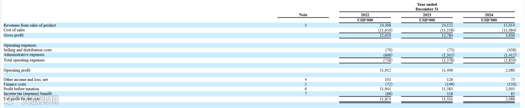 根据F-1招股说明书,2022年、2023年和2024年,公司收入分别为2430.6万美元、2412.2万美元和1501.4万美元,2024年同比下滑达37.7%。尽管营收减少,公司2022年和2023年毛利均保持在1270万美元左右,毛利率分别为52.1%和53.0%,但2024年毛利骤降至393万美元,毛利率亦跌至26.2%。这一下滑主要源于收入下行而成本相对刚性。