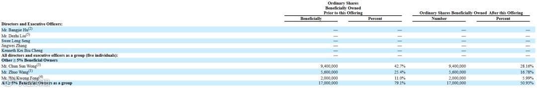 根据F-1文件披露,东方润欣在IPO前由三位主要个人股东控制:Mr. Chun Sun Wong(持有940万股,占比42.7%)、Mr. Zhuo Wang(560万股,占25.4%)、Mr. Wai Kwong Fong(200万股,占11.0%)。三人合计持股比例高达79.1%。IPO发行普通股后,三位大股东的持股比例分别稀释至28.16%、16.78%和5.99%,但仍合计控制超过50%的股份,保持绝对控股地位。