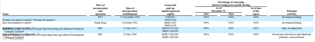 东方润欣通过在福建宁德柘荣县设立的境内运营公司——闽东红集团有限公司开展业务,其拥有位于柘荣县的14个自有茶园,以及配套加工厂,为公司提供稳定的原料来源。同时,公司还开展批发和零售业务,服务终端消费者与分销商。