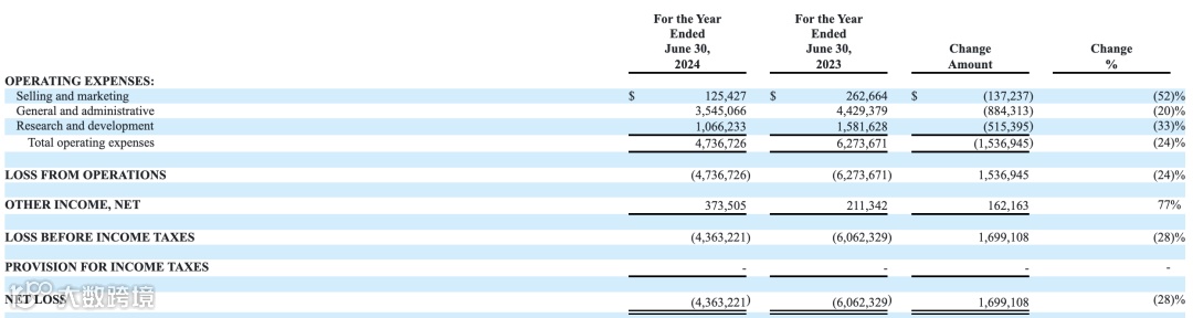 根据SEC数据,Regencell Bioscience Holdings在2024财年运营支出为473.7万美元,较2023年的627.4万美元下降24%。各项费用均有下降,尤其销售费用减少52%,研发费用下降33%。同时,其他收入同比增长77%,达到37.4万美元。净亏损从2023年的606.2万美元缩减至436.3万美元,降幅达28%,显示出公司在控本增效方面取得积极进展。