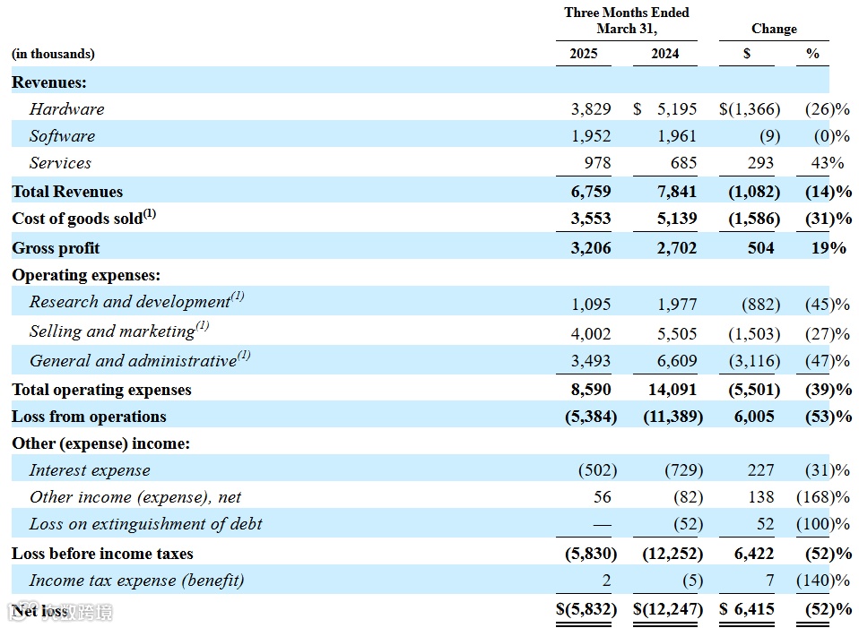 S-1披露数据显示,zSpace在2024年实现营收3,809万美元,较2023年下降约13%,主要因美国教育市场拨款节奏放缓。其中,美国本土市场贡献88%营收,海外市场占比12%。2025年第一季度,公司营收为675.9万美元,毛利为320.6万美元,毛利率维持在47%左右。尽管公司仍处于亏损阶段,2024年净亏损为2,082万美元,一季度亏损为583万美元,但调整后EBITDA在2024年为-986.8万美元,显示运营成本控制正在优化。值得关注的是,2024年公司研发支出为489万美元、销售营销支出为1,591万美元,管理费用也保持高位,反映出其仍在扩张期中积极投入。
