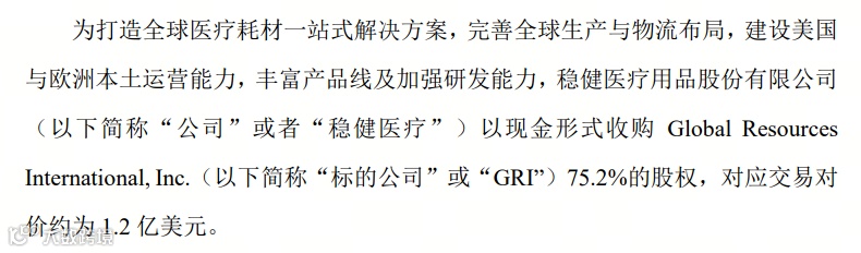 9月23日,稳健医疗(股票代码:300888)发布重要公告,宣布成功以约1.2亿美元现金收购Global Resources International, Inc.(GRI)75.2%的股权。此次交易旨在强化公司在全球医疗耗材市场的生产与物流体系,同时拓宽产品线和提升研发实力。GRI作为目标公司,2023年度收入超过1.5亿美元,其中美国市场贡献显著,占比约七成。