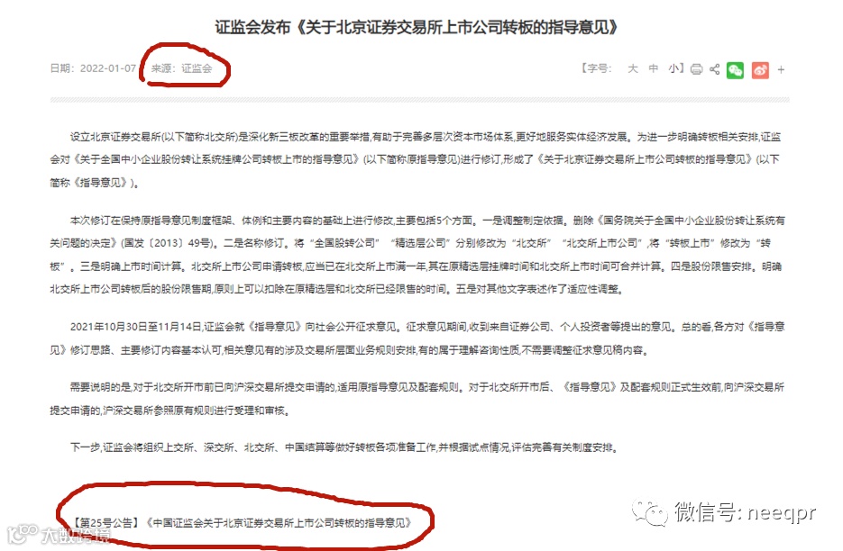规范是监管部门越来越强调的内容,同时自身的规范性也更加清晰。2022开年首周,很多朋友发现了,证监会第一周就一猛子更新了很多新的政策,总共25个文件,咱们今天重点就唠两句这个25号文件,《中国证监会关于北京证券交易所上市公司转板的指导意见》。