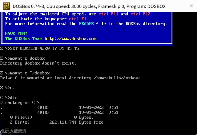 默认情况下,DOSBox进入Z:\虚拟驱动器,如果需要切换目录,请挂载本地路径: