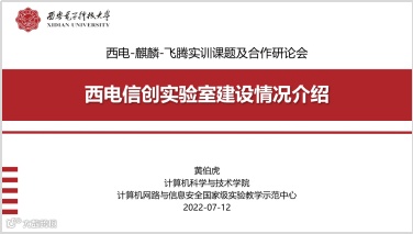 接下来的报告环节,黄伯虎首先从“为什么要建信创实验室、建设历程及现状、未来规划”三个方面对西电信创实验室建设情况进行了详细介绍。飞腾信息技术有限公司人才发展部任巨对西电信创实验室建设现状给予了高度评价,并对飞腾在信创方面发展情况做了介绍,提出未来可以利用飞腾提供的硬件信创平台,通过实训合作、联合实验室建设、高校学科竞赛、产学融合项目、毕设指导等形式联合培养信创人才。