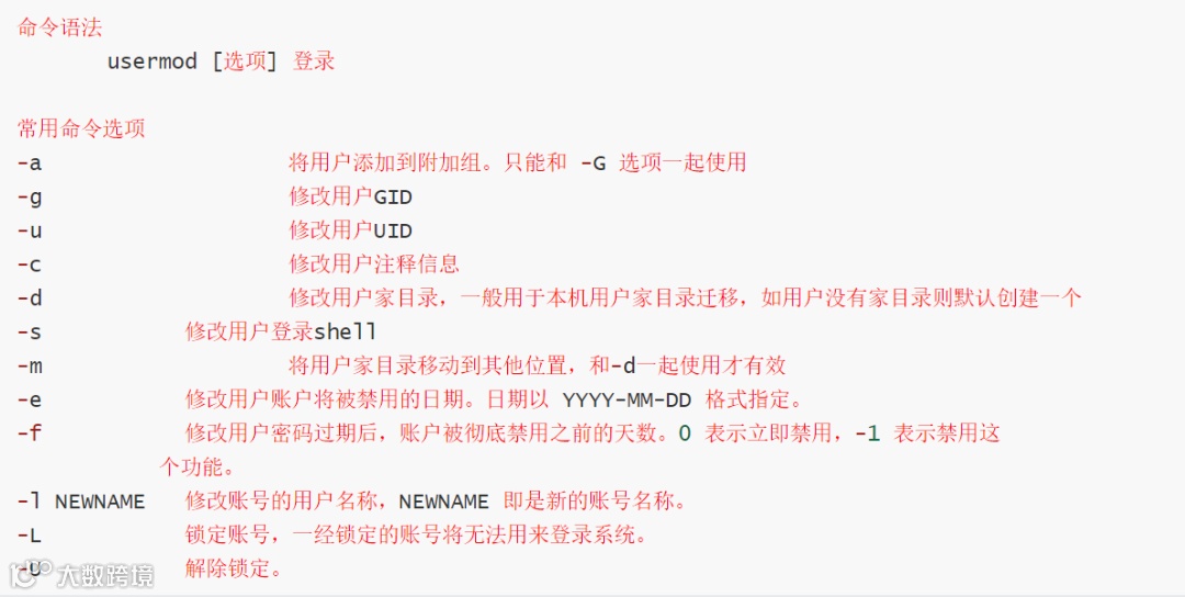 usermod - 修改一个用户账户 [修改系统账户文件和在命令行上指定的相关更改]。