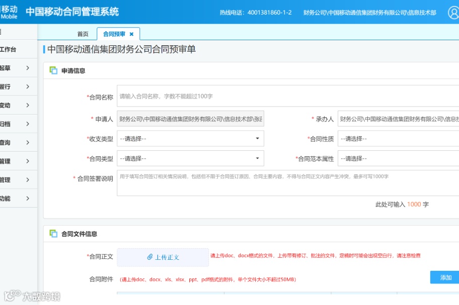 目前,按照公司管理要求,采购需求部门以邮件形式将商务规范书(即合同主体)、技术规范书等材料提交法律部门、财务部门预审核后,将采购需求以附件形式在供应链管理系统中提交,采购部门据此制定采购方案并实施采购。由于预审环节与合同起草没有实现系统对接和数据共享,不能体现相关部门的审核痕迹,在合同起草后,法律部门、财务部门还需要再次进行全面审核,增加了额外的工作量。