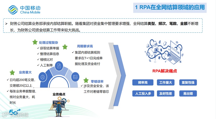 公司结算业务部于2020年10月上线财务机器人(RPA)项目,通过不断优化与创新,实现了跨系统的全流程自动化处理,将结算效率提升9-10倍,达到资金结算准确率100%,有效提升全网内部结算效率。公司《RPA赋能全网内部结算助力效率提升》课程从RPA的定义、特征及应用场景引入,循序渐进,系统性介绍了公司全网内部结算机器人在全网结算领域的应用、应用效益、具体实施方案以及技术亮点等,持续赋能公司数智化转型升级。