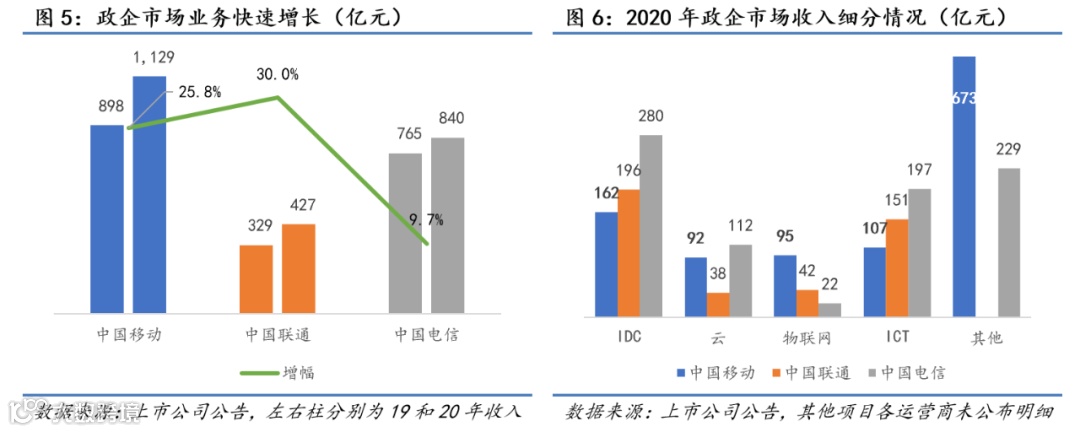 近年来,在传统业务面临较大增长压力的情况下,三大运营商均加大政企市场拓展力度。2020年,三大运营商政企市场业务收入2,396亿元,占总营收比重达到16%,较2019年增长20.3%。我公司政企市场业务收入1,129亿元,较2019年增长25.8%,好于行业平均水平。