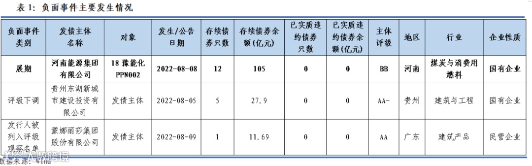 “18豫能化PPN002”本金余额5亿元人民币,根据公告,“18豫能化PPN002”展期。截至2022年8月11日,河南能源集团存续12只债券,存续债券余额105亿元,尚无实质违约债券。