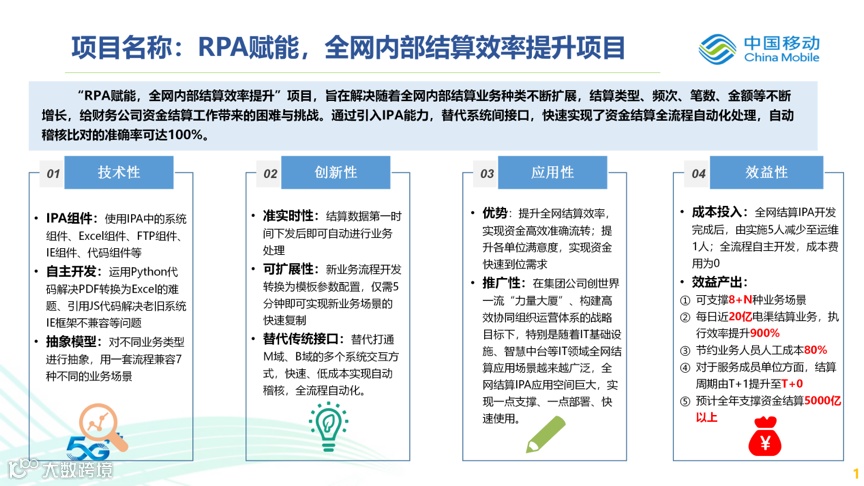 在中国移动“第二届IT创新大赛-RPA应用创新竞赛”中,中国移动财务公司“聚财铸智”IPA战队的“RPA赋能,全网内部结算效率提升”项目经过前期方案预审、复赛答辩,成功入围决赛!