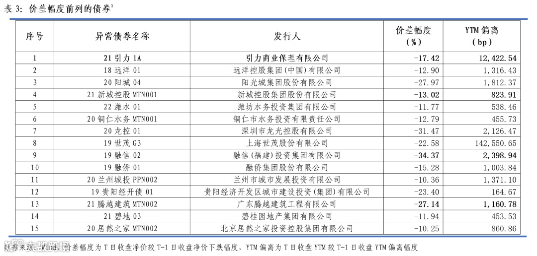 通过观察债券交易价格偏离程度,上周涉及15家发债主体相关债券成交价格异常。