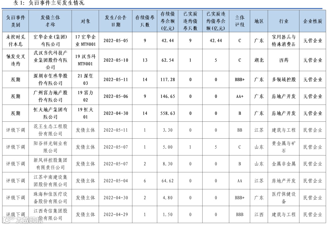 ★ 债券违约相关事件5起,为历史违约主体宜华未按时兑付本息,武汉当代科技触发交叉违约,钜盛华、富力地产、恒大地产展期。