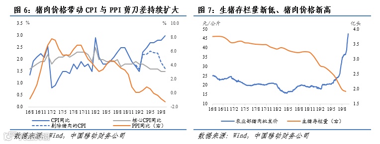 9月CPI同比增长3.0%,突破通胀心理位置;PPI同比减少1.2%,呈持续回落趋势。三季度CPI与PPI剪刀差持续扩大,主因猪瘟背景下的猪肉价格及相关替代品价格快速上涨。然而受到内需不足的持续影响,核心CPI和PPI持续回落,导致物价除了猪肉以外均呈平稳甚至通缩的走势。当前,生猪存栏量加速回落,猪肉价格轻松突破前高,市场对猪肉价格飞涨的预期持续加强,对央行货币政策和债券市场利率已造成显著影响,成为年内债市最大风险。