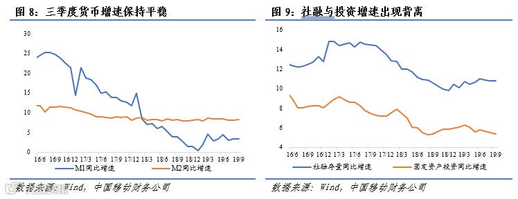 9月M2同比增长8.4%,较上月上升0.2个百分点;M1同比增长3.4%,较上月持平。受减税降费措施和专项债发行规模同比减少影响,财政存款9月减少7,026亿元,同比多减3,553亿元,支撑M2增速小幅回升。但是M1增速持平与企业存款多增形成对比,表明企业活期存款增长弱于定期存款,反映出企业投资意愿较低。