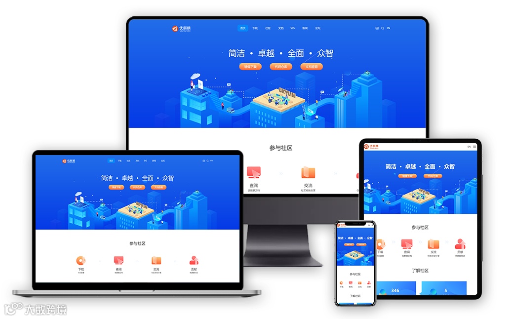 优麒麟官网基于品牌主色调设计,以简约而不简单的蓝色风格、响应式交互布局,让爱好者在浏览官网内容的同时也能享受极致的视觉体验。