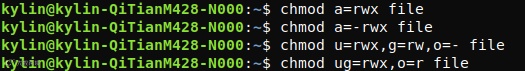 属主读写执行,属组读写,其他人无权限: chmod u=rwx,g=rw,o=- file 属主属组读写执行,其他人读权限: chmod ug=rwx,o=r file
