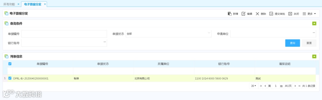 点击【新增】填写所属单位,银行账号,填报说明后在下方添加选择票据信息。