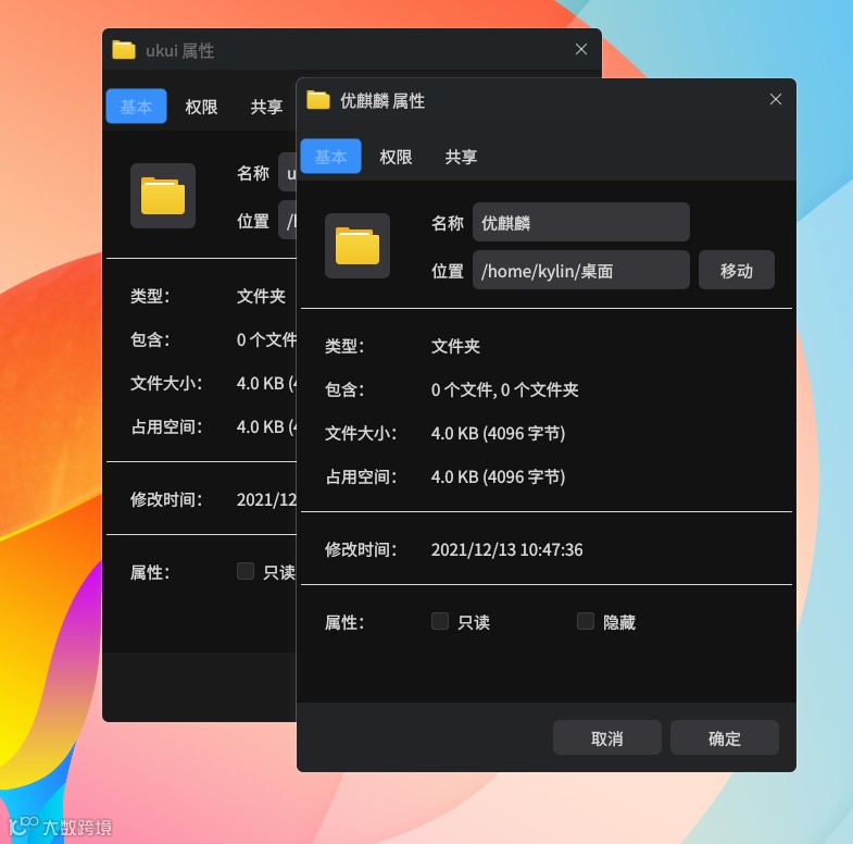 在优麒麟之前的版本中,可能有这样一种情况:同时打开多个窗口时,无法区分当前选中的是哪一个窗口。为了避免这种情况,我们在原有基础上进行了一定的更改,对于选中的标题栏与未选中的标题栏,我们对字体和标题栏背景色做了明显的颜色区分,这样方便用户能更好的辨别哪个是当前所选中的窗口,如下图所示: