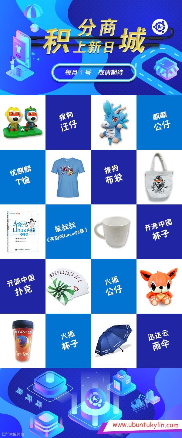 为回馈广大爱好者对优麒麟的支持,优麒麟2019积分商城在今日正式开启。本次积分商城采用全新模式,不再是限时竞拍,而是改成兑换模式,并且没有限定时间,只要你有麒麟币,就可随时来到积分商城进行纪念品兑换。更加惊喜的是,我们的纪念品也将同时升级,本月上新的有优麒麟T恤、麒麟公仔、搜狗汪仔、搜狗布袋、开源中国马克杯、开源中国扑克、火狐公仔、火狐水杯、《奔跑吧Linux内核》书籍、迅达云雨伞等纪念品。并从下月起将会在每月1日上新。