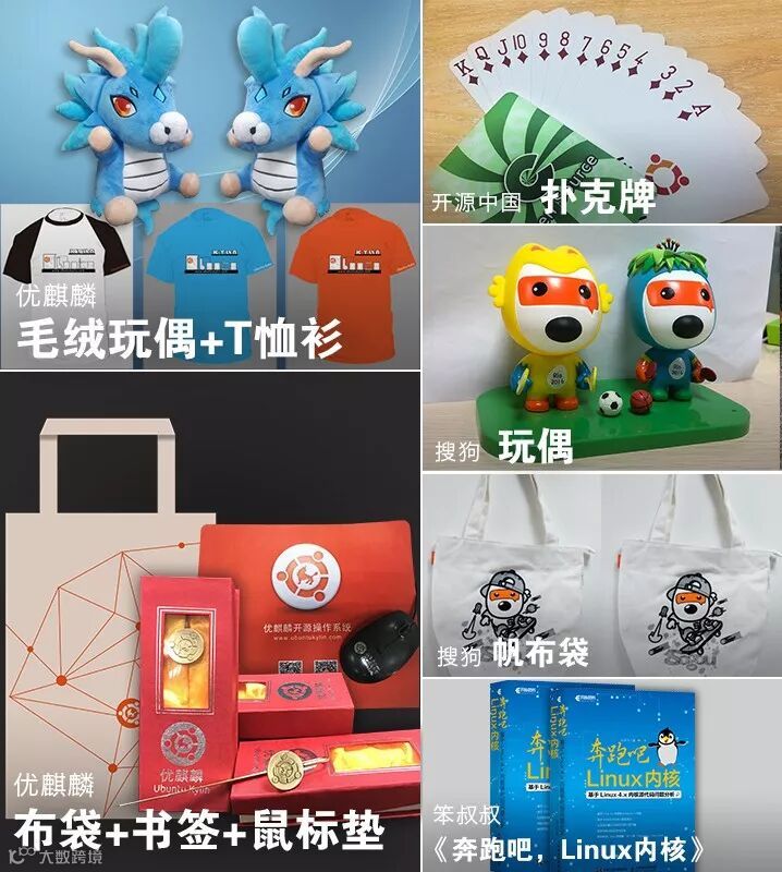 附:活动纪念品(有优麒麟公仔、优麒麟T恤、开源中国扑克、Linux内核书籍、搜狗输入法汪仔等等,惊喜不断!)
