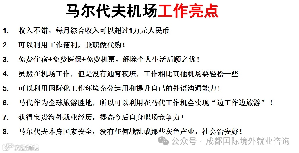 马尔代夫官方国际机场维拉纳国际机场也称为马累国际机场,是马尔代夫首都机场;随着中国旅客的大量进入导致马尔代夫机场对会说汉语的机场工作人员数量需求不断增加。