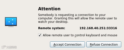 VNC 为一种使用 RFB 协议的屏幕画面分享及远程操作软件。此软件借由网络,可发送键盘与鼠标的动作及即时的屏幕画面。VNC 更适合与远程主机在同一子网下使用,因为 VNC 本来是开发用在局域网的环境,因此用在互联网上存在安全问题,当您计划在远程位置访问远程 PC,您应该考虑一个专用的调制解调器或 ISDN 的拨号连接,VPN 隧道,使用 SSL 或包裹 VNC 通信,这里不做赘述。