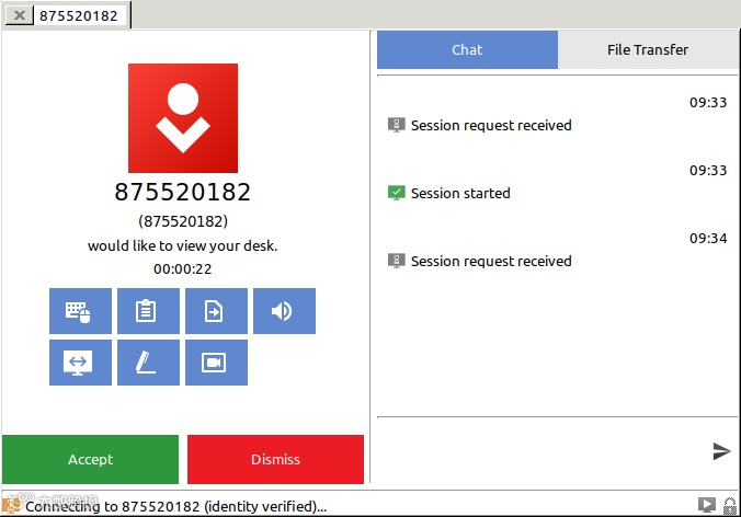 AnyDesk 会弹出会话确认框,当您选择允许后,这个会话框也可以作为会话管理、文件传输等功能的入口。同时可以选择控制细节,比如是否允许收听声音、使用鼠标键盘、剪贴板,并且还能锁定键盘和鼠标。