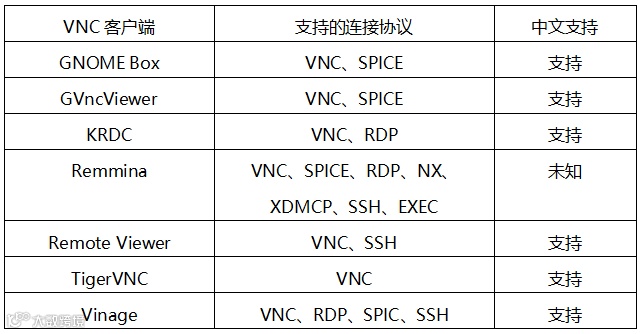 VNC 系统由客户端,服务端和一个协议组成,是一个 GPL 软件,所以可选的方案极为丰富,下表将给出一些 VNC 客户端支持的协议的比对。
