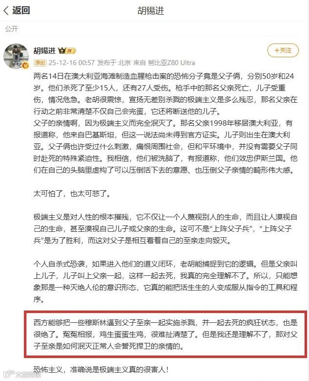 (大华新闻|环球云视 时事评论员 葛晨)读罢胡锡进先生关于最近发生的澳洲悉尼邦迪海滩恐怖袭击的评论,字里行间透着一种令人脊背发凉的“理中客”。他感慨“西方能把穆斯林逼到父子齐上阵”,这话听着耳熟——像极了那句臭名昭著的“要不是你裙子穿得短,流氓怎么会盯上你?”
