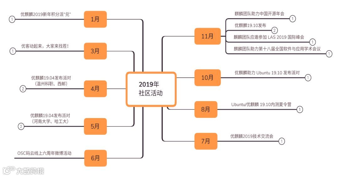 2019年,开展了15次社区活动(参加14场活动,主办9场,受邀参加1场国际会议):线上包括积分派“兑”、内测夏令营、以及参与码云六周年活动,线下包括举办优麒麟系列发布派对、技术交流会等,并成功打卡最高海拔学府—西藏大学。参与Ubuntu 19.10 发布派对、中国开源年会、第十八届全国软件与应用学术会议进行主题演讲,2019年最值得骄傲的是受邀参加LAS国际峰会,优麒麟和UKUI桌面环境获得国际开源社区认可。