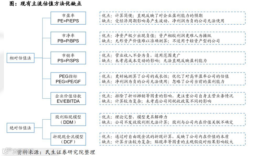 传统估值方法可分为相对估值法和绝对估值法,各类估值方法都有一定的优缺点,但大多适用于业务成熟度高、营收利润稳定的公司。