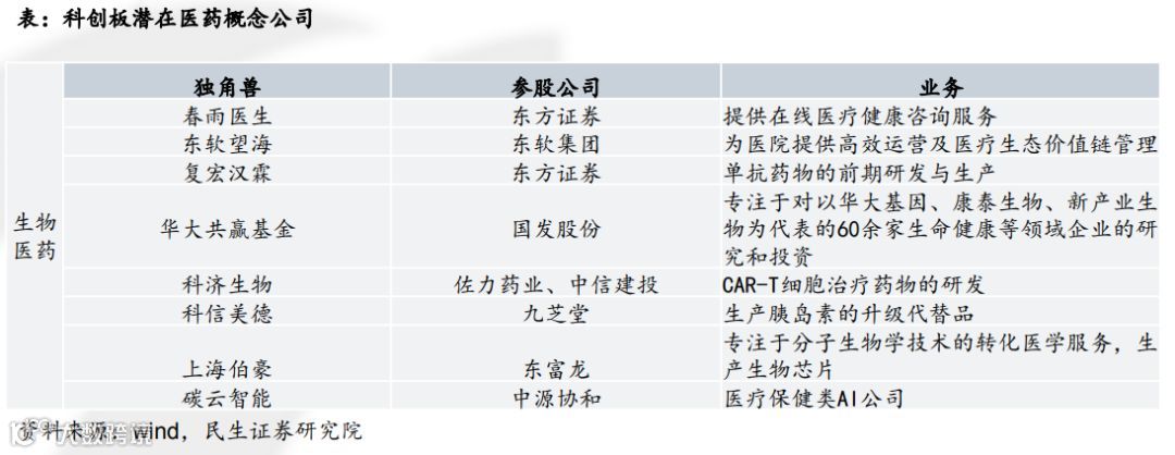 根据科创板的上市准则和目前传言有望上板的公司看,有望上市的医药公司主要有以下四类:1.创新药产业链公司,如尚未盈利的,但已有产品处于临床一二期的,具有前景的 1.1 类新药;或者一些创新药产业链公司,比如 CRO/CDMO 等;2.创新医疗器械公司,如生产一些创新型的设备、医疗高值耗材、新生物材料的公司;3.基因检测类企业,如提供肿瘤基因筛查、基因大数据公司;4.涉及医疗信息化、互联网医疗等新医疗经济模式的公司,如春雨医生。