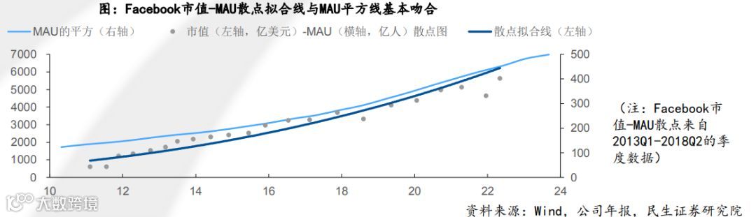 由于互联网的开放性及用户间的互动将产生巨大的网络效应,互联网公司不仅能获得用户群体的直接贡献,也能获得用户互动产生的潜在贡献,在模型中表现为用户价值的平方。以Facebook为例,公司市值-MAU散点拟合线与MAU平方线基本吻合,验证了DEVA模型在实践中的有效性。虽然DEVA模型高估了用户数无限增长的效用,导致了2000年后出现的互联网泡沫。但该模型指出了互联网公司估值的关键因素——用户数,在当前仍具有较强的启示价值。