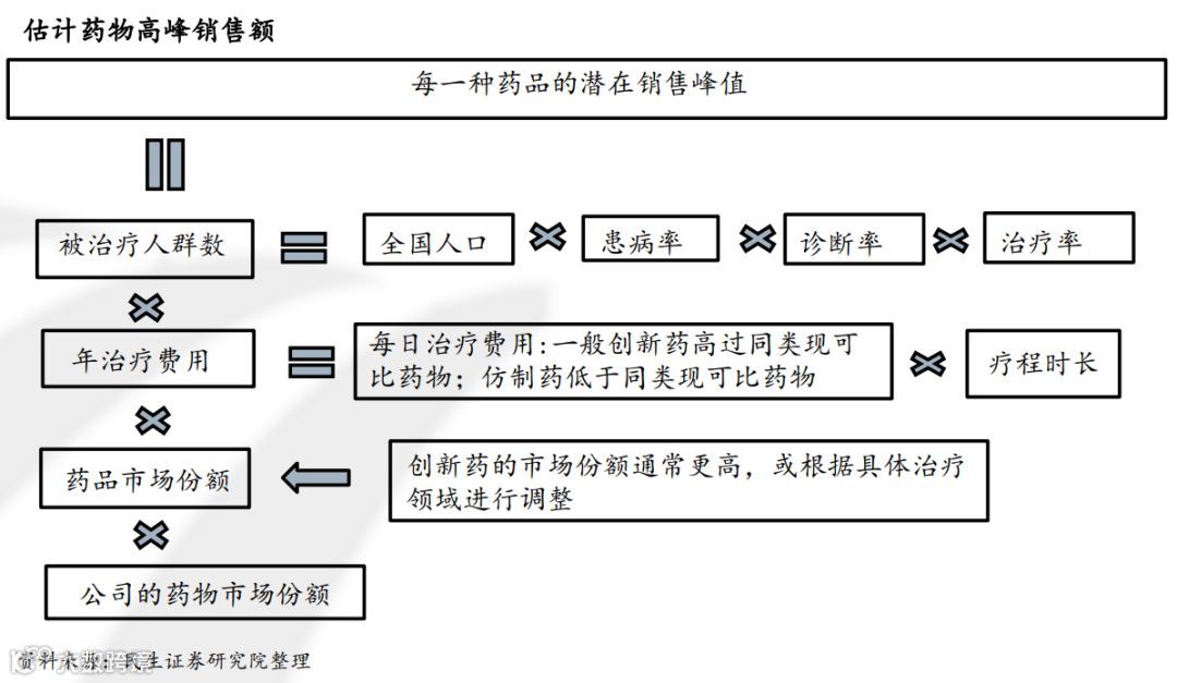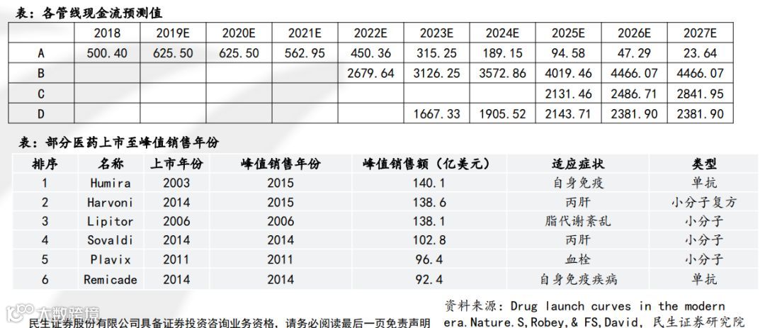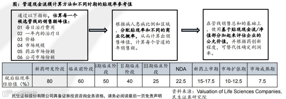 现金流的假设则需要根据考虑对应患者情况,峰值市占率等多因素,因此可以采用研发管道现金流贴现模型进行计算。