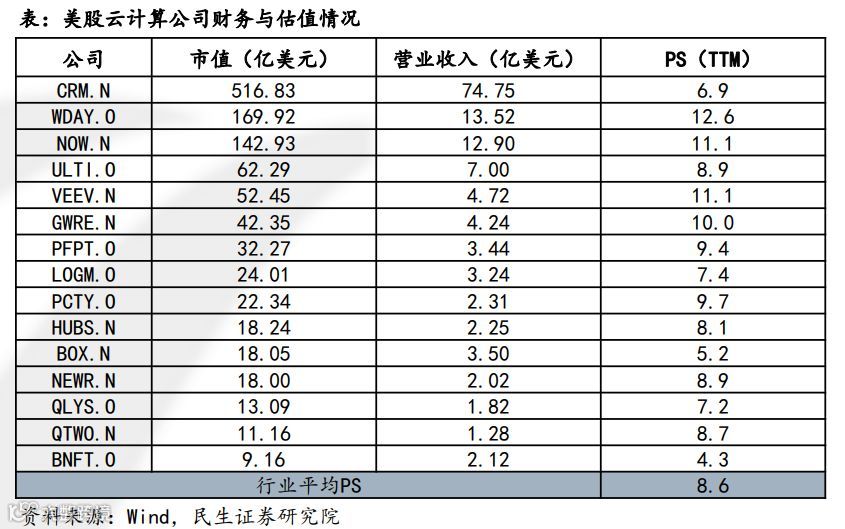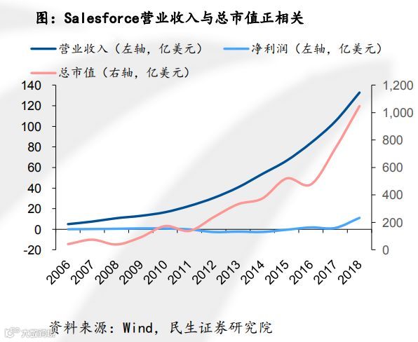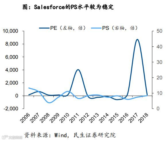 以美国云计算巨头Salesforce为例,公司2006-2018年间收入快速增长,但盈利能力并不稳定,公司市值与营业收入呈现较为明显的正相关性。从估值水平来看,公司PE波动较大缺乏参考价值,而PS则基本处于6-9x的区间。由此可见,对于云计算公司,PS是更为适宜的估值方式。