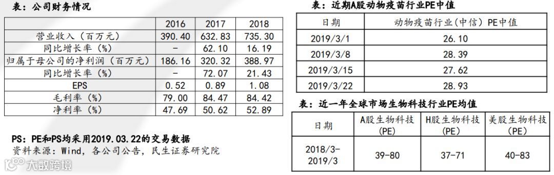 从公司财务数据看,营收和净利润增速出现下降,但是公司的毛利率,净利率相对较高,财务质量相对较好。外加公司在手专利与上市产品的口碑均在行业领先地位,动物疫苗行业发展也相对成熟,我们认为可采用PE估值法,目前动物疫苗行业中值PE在26-30之间,考虑科创板的市场情绪及全球市场生物科技行业PE均值,我们预计公司PE在30—50X间,预计公司市值在117-195亿间。
