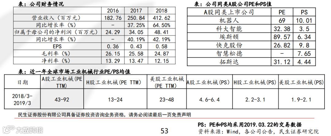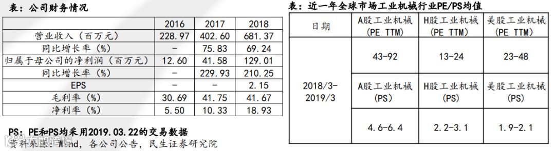 目前,虽然公司工业机器人集成业务技术与模式已较为成熟,其中在汽车制造流程中的焊接部分自动化产品渗透率已经非常高,但未来在工业机械方面,存在技术延伸的可能。目前虽然运营模式与A股同类公司存在近似,但是A股同类公司的PE波动相对较大,而PS区间则相对明确多在5-10间。此外,对比全球市场工业机械PE和PS估值,A股估值相对较高,因此采用A股同类PS估值相对符合国内科创板行情。因此建议采用参考国内A股公司PS估值,PS 5-10X,市值约在20-41亿间。