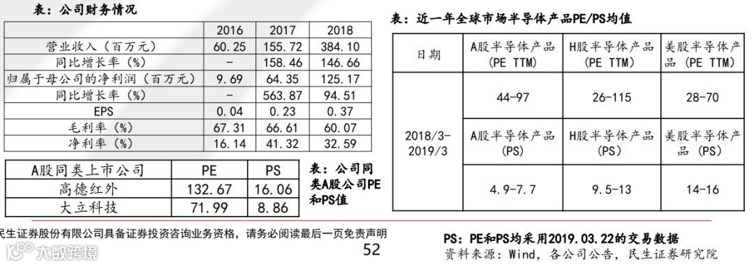 睿创微纳:作为在百万级像素红外MEMS芯片、12及17微米探测器领域有多项突破,且所掌握的非制冷红外芯片设计技术,仅4国家拥有。公司采用预计市值不低于人民币10亿元,最近一年净利润为正且营业收入不低于人民币1亿元的第一类创业板上市标准,说明公司对自己的盈利能力有信心,可作为成熟期科技企业进行预测估值。