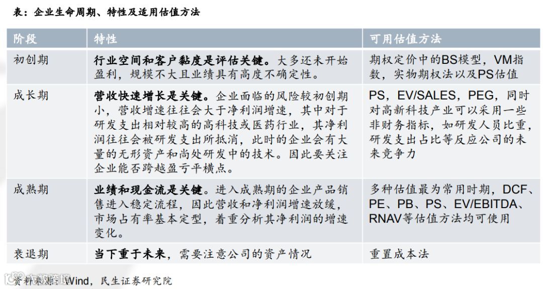 企业生命周期可分为初创期、成长期、成熟期和衰退期四个阶段。处于不同时期的企业有自身的营运特性,因此不能简单采用目前二级市场常用的PE估值法。